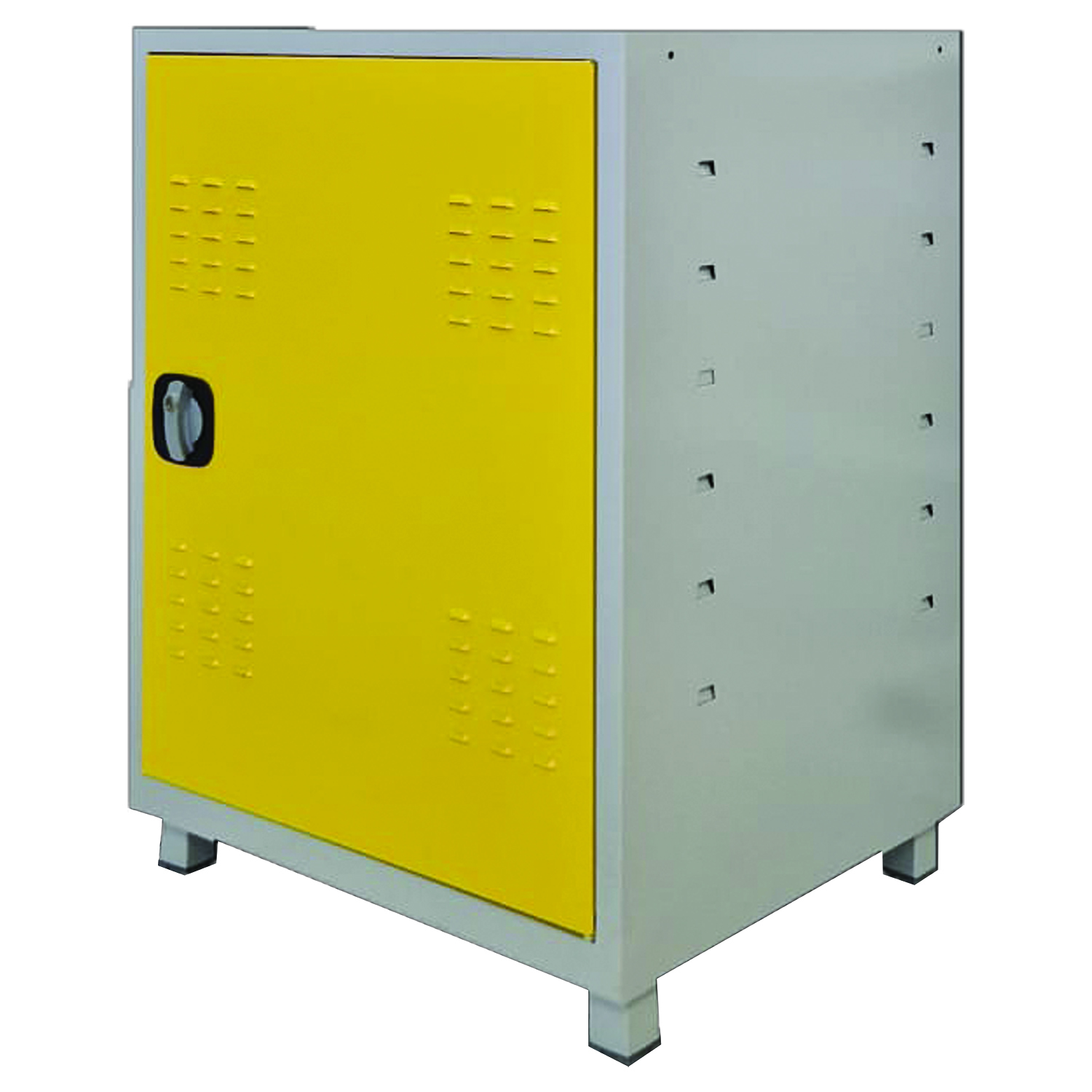 Finisaje profesionale: dulapul este vopsit în câmp electrostatic, cu corp gri deschis RAL 7035 texturat și ușă galbenă, oferind rezistență la uzură și un aspect modern. Baza este prevăzută cu soclu și picioare reglabile de 50 mm cu terminații din plastic pentru stabilitate.