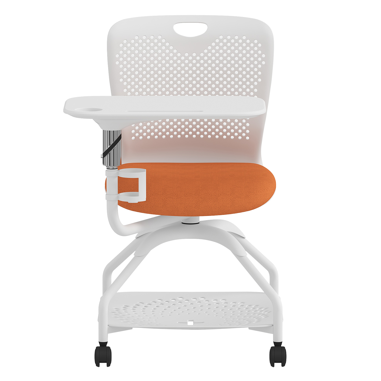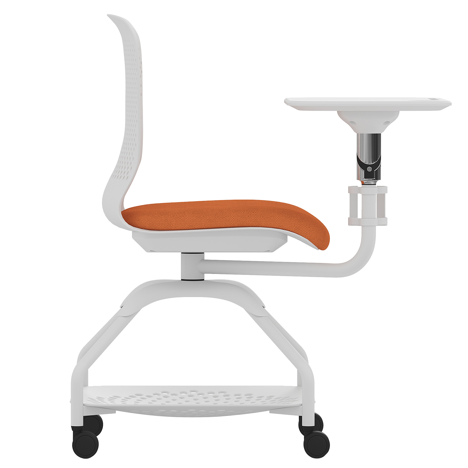 Acest scaun modern cu roți este creat special pentru spațiile educaționale și de training, unde flexibilitatea, confortul și funcționalitatea sunt esențiale. Conceput într-un design tip scoică din polipropilenă și prevăzut cu un șezut moale, tapițat cu stofă, scaunul oferă o experiență ergonomică superioară. Masuța laterală integrată și suportul inferior transformă acest model într-o soluție completă pentru lucrul individual, învățare sau activități interactive.